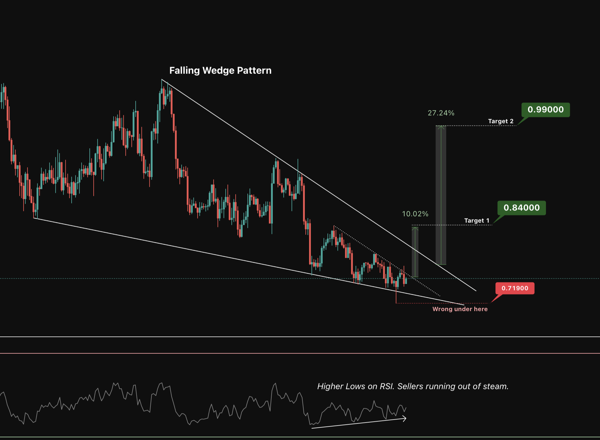 After confirmation from the Total2es chart on which route we’re taking, I have a few trades for either case. I’ll present to you the bullish ones today as that is where I am slightly leaning for the next few days. Of course my view is dynamic and chosen by the overall altcoins chart presented above.